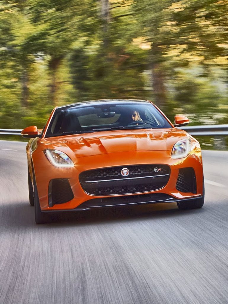 Part beauty-pageant contestant and part muscle builder, this F-type looks the part. The SVR’s provocative exterior is mildly tweaked in the name of performance. The reworked front fascia incorporates larger air intakes along with nostrils in the hood to aid cooling. To keep the car stuck to the ground at Jaguar’s advertised top speed of 195 mph, vents are sculpted into the front fenders to prevent front-axle lift, while an SVR-specific diffuser and a larger wing aid downforce in the rear.